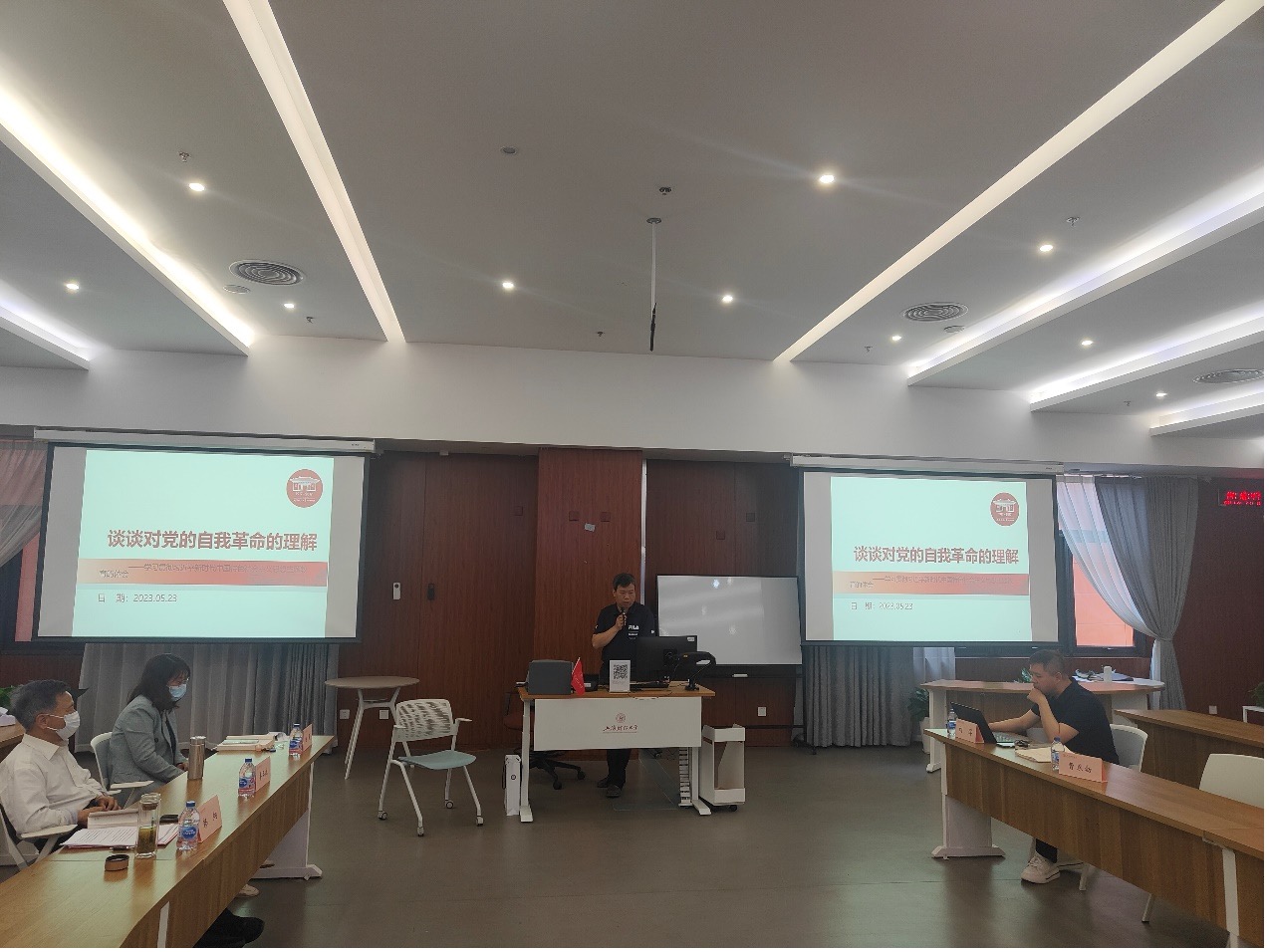 马克思主义学院教工第二党支部书记韩炯副教授主要谈了他对党的自我革命的理解,从打破历史周期率魔咒的新答案、自我革命的四层含义和把握自我革命的根本政治方向三个部分娓娓道来。韩炯老师着重分享了学习《论党的自我革命》的收获体会。他表示,习近平总书记在党的二十大报告中强调自我革命是跳出治乱兴衰历史周期率的第二个答案。他进一步阐述了全党开展集中性学习教育重要途径和重要经验、新时代政治勇气和改革精神的新升华以及新时代管党治党规律性认识的新高度。自我革命必须坚持以党的政治建设为统领,坚守自我革命的根本政治方向。