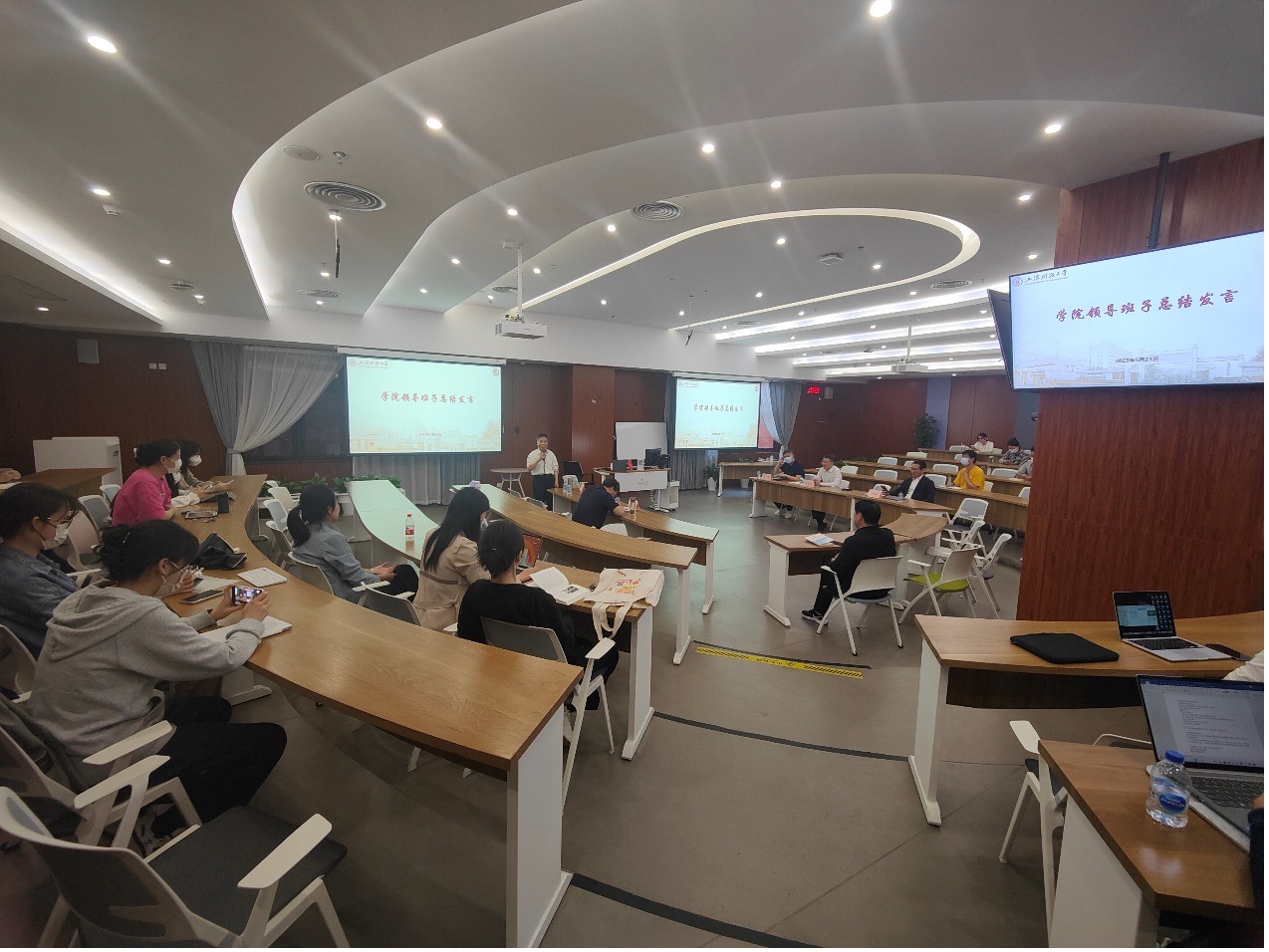 马克思主义学院领导班子成员交流了学习体会。学院党委书记曹东勃认为,鲁品越教授以鲜活的事例对中国式现代化、两个确立等作了学理化的阐释解读,特别是对现代化道路的中西比较及其时代背景的挖掘,让大家受益匪浅。二十大报告对中国式现代化理论和道路的新概括,是对十九大报告对于“新时代”的“三个意味着”的全面拓展和深化,作为马院教师,需要在教学科研过程中充分挖掘这一命题的深刻内涵及其创新实践。副院长丁晓钦认为,鲁品越教授对中国式现代化解读全面且深刻,从历史到现实进行深入分析,这不仅是一场主题学习报告更是一次颇具启发的学术报告,我们需要在下一阶段的理论研究与阐释过程中对此做出深入挖掘。副院长刘洋结合课程建设情况表示,下一步需要推动中国式现代化的研究成果转化为反哺课堂教学的重要支撑。