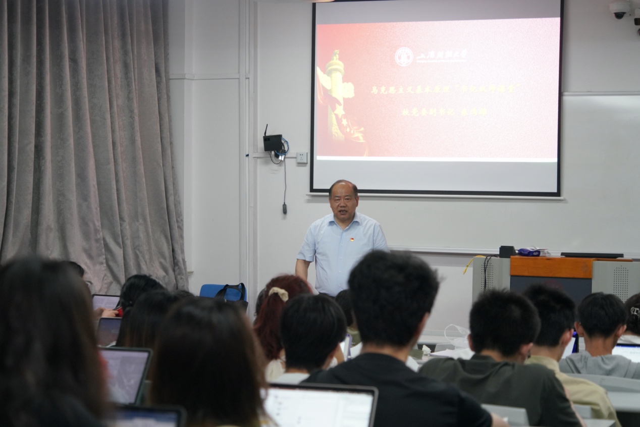5月29日上海财经大学党委副书记朱鸣雄走进《马克思主义原理》课堂,与马克思主义学院周杰老师共同为同学们上了一节生动的思政课。课程一开始,朱书记首先与同学们进行了简短的交流和互动,强调了他与同学们亦师亦友的关系,本次双师课堂在轻松愉快的氛围下开始。