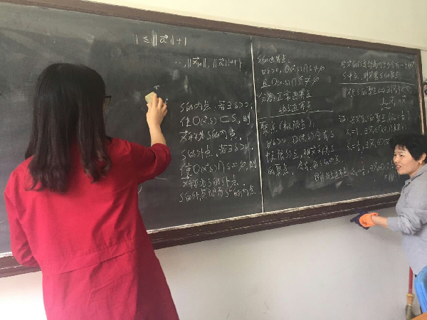 【同学们在保洁阿姨的指导下完成着不一样的清洁工作。擦黑板也是有小技巧的哦。】