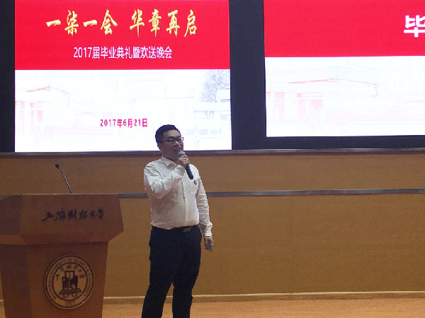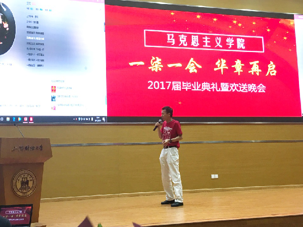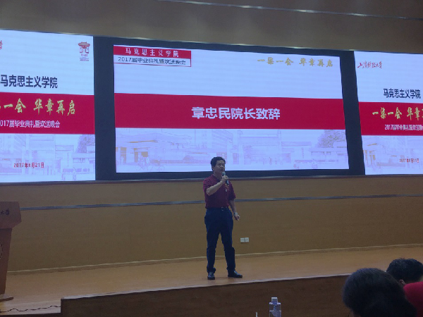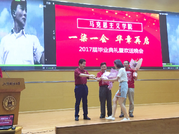 岁月如歌!又是一年毕业季,上海财经大学马克思主义学院培育的20名硕士研究生和博士研究生即将告别母校,奔赴祖国各地不同的工作岗位,同时亦将迈向各自的人生新阶段。此外,2017,这个在上海财经大学师生眼中绝不平凡的一年,正值上海财经大学百年华诞。在此具有双重重要意义的时间节点,上海财经大学马克思主义学院师生悉心筹办了2017届毕业典礼暨欢送晚会。 2017年6月21日晚,晚会在上海财经大学创业中心一楼报告大厅隆重地拉开序幕。马克思主义学院院长章忠民教授、直属党支部书记范宝舟教授,以及马克思主义学院的各位老师、各位毕业生及在读学生参加了本次晚会。
