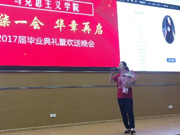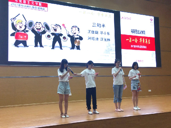 由师生们奉上的精彩节目是本次晚会的最大亮点。由2016级硕士曾彬和任乐乐同学演唱的经典老歌《同桌的你》触动了大家的心弦,让人不禁伤别离;由马院四位“小天使”王佳瑞、毕小乐、刘裕诗、汪玉婷带来的脱口秀《三句半之毕业季》让大家捧腹不已,奉上了他们对师兄师姐的美好祝愿;马院“赛西施”夏明月老师演唱了《遇见你是我的缘》,曲调高扬宛转,引发师生们的一致好评;范宝舟书记带来了一首《龙文》,展现了范书记的男儿柔情;有“马院李谷一”之称的范静老师献上了一首《乡恋》,博得大家的喝彩;鲁品越老师难得一展歌喉,献上了经典的苏联民歌《三套车》;“马院大才子”曹东勃老师饱含深情地献唱了一首《母亲》,深深地感染了大家;刘晓音老师和任乐乐同学合唱俄文版《莫斯科郊外的晚上》,歌声婉转悠扬;龚剑老师和曾彬同学合唱《花开在眼前》,配合默契,展现了浓浓的师生情谊;章忠民院长、马拥军教授、鲁品越教授合唱聂耳的经典歌曲《毕业歌》,展现了老一辈师长浓浓的家国情怀。最后,由全体学生合唱经典歌曲《当》,将晚会引入高潮。