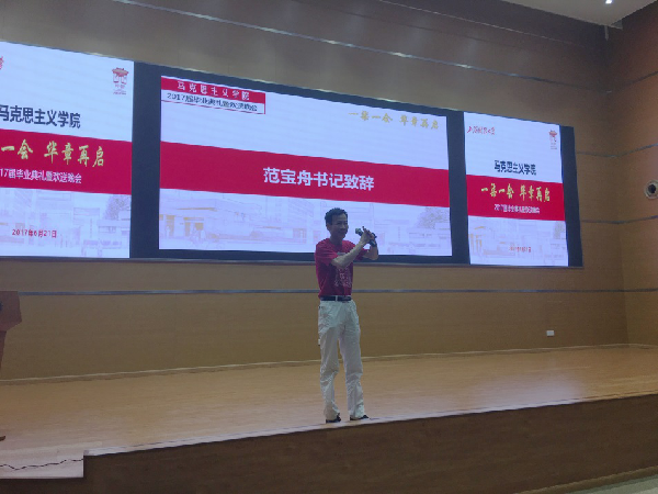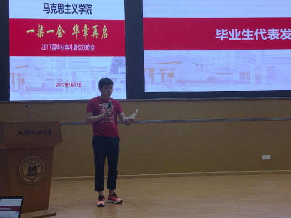 随后,学院领导、教师代表和毕业生代表一一上台发表讲话。章忠民院长首先恭贺了2017届毕业生们的顺利毕业。他引用黑格尔的名言:“一个过程的终点同时又是另一个过程的起点”,以此寄语毕业生,希望毕业生们继续秉持上海财大“厚德博学,经济匡时”的校训,以及马克思主义学院马克思主义的理论底色,走向工作岗位,披荆斩棘,创造更大的成绩;范宝舟书记深情地回顾了自己的人生往事,并期望毕业生们能够“常回家看看”,常回马院看看;马克思主义学院资深教授鲁品越老师富有激情地勉励大家要有理论自信,“敢于亮剑”,用马克思主义这一真正科学和有力的理论武器解决现实问题,做出成绩;冯金华教授和青年教师代表徐圣龙老师都奉上了对毕业生们的美好祝福。