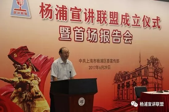 2017年6月29日,杨浦区委宣传部在复旦大学新闻学院蔡冠深演讲厅举行“杨浦宣讲联盟成立仪式暨首场宣讲报告会”。 区域内高校党委宣传部、马克思主义学院有关领导,区街道(镇)、委办局、群团、企业分管领导和宣传工作负责人,区域内宣讲团骨干成员,两新组织代表,社区代表共200余人参加活动。杨浦区委常委、宣传部长刘东昌出席会议并讲话。
