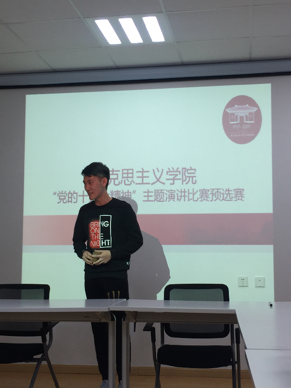为深入学习贯彻党的十九大精神,进一步激励大学生积极向上、刻苦学习、自觉担负起新时期党和人民赋予的历史使命,牢牢紧扣学习宣传党的十九大精神这一中心主题,我院积极组织了“党的十九大精神”主题演讲比赛。并于2017年10月24日在马克思主义学院楼102会议室举行了预选赛。 经过初选,本次预选赛共有16名同学参加。为了保证比赛的顺利开展,本次比赛提前两周在学院内进行了宣传与动员,学院直属党支部书记范宝舟教授亲自为大家讲解“习近平7.26重要讲话”精神。为了迎接比赛,每位参赛者都认真观看了十九大会议的相关直播和视频,并进行了更加深入的学习和研究。每位参赛者都从不同的角度切入,根据自己的所思所想、所感所悟向评审委员会提前递交了讲稿、背景PPT、背景音乐资料等。本次比赛由范宝舟、龚剑、刘洋、韩炯、戴媛媛、孙鹏共6位老师担任评委。