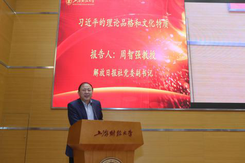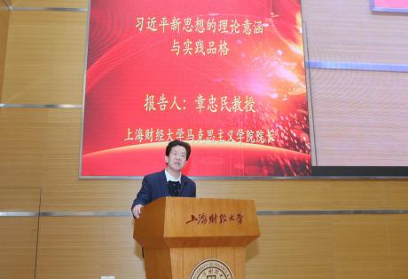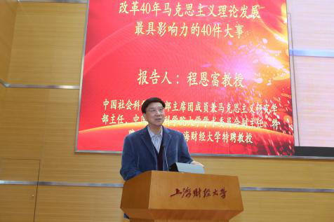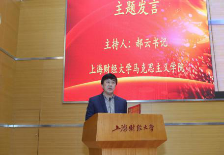 马克思主义学院郝云书记主持了本次论坛的大会主题阶段。程恩富、周智强、鲁品越、章忠民、汪青松、孙力6位教授分别在大会主题发言阶段发言。国社会科学院学部主席团成员,中国社会科学院大学学术委员会副主任、特聘首席教授,上海财经大学特聘教授程恩富教授阐述了改革开放四十年中马克思主义理论发展最具影响力的四十件大事,每一件大事背后都有着非常重要的意义,涉及重要的会议,以及经济建设、文化建设、学科建设、书籍出版等方面。程恩富教授用他深厚的理论功底,清晰而富有调理的思路,带给我们在这40年间完整的马克思主义理论的发展过程。解放日报社党委副书记周智强书记认为文化领导力是习近平总书记领导力的魅力所在,文化领导力不止是外在的形式,而是表现为与政治理念、政治追求相匹配的一系列的战略行为,包括战略担当、战略思维、战略情怀等方面。上海财经大学马克思主义学院院长章忠民教授结合自身研究的实践,阐述了习近平新思想的理论意涵和实践品格,他认为习近平新思想的理论内涵,最深刻的理论内涵是当代马克思主义,是马克思主义中国化理论的丰富和发展,是一次伟大的飞跃;习近平新思想的实践品格是始终坚定不移的以人民为中心。同时,章忠民教授认为要系统深入细致的有效的把握习近平新思想的理论意涵和实践品格就要加强习近平新思想的整体性研究,包括历史整体性、空间整体性、实践整体性、理论整体性。