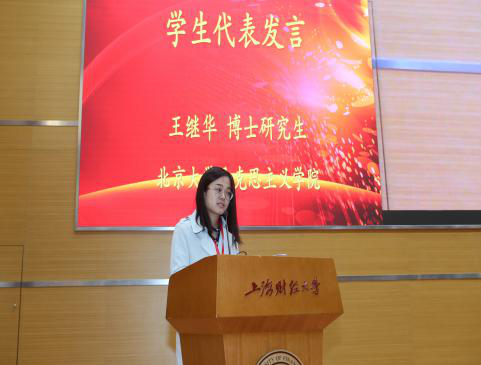上海财经大学马克思主义学院博士研究生王跃和北京大学马克思主义学院博士研究生王继华作为学生代表发言。王跃同学结合自身经历,回顾了历次参加上财马院全国马克思主义研究生学术论坛的感受和收获,回顾了从相遇到走进上财马院的历程。王继华同学结合习近平总书记今年在北京大学与师生代表座谈时对青年提出的四点希望,谈了当代青年学子的历史使命。