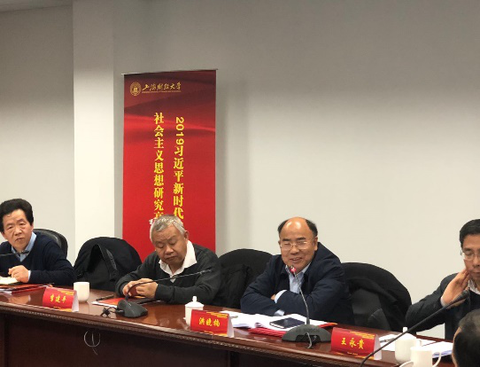 1月22日上午,教育部哲学社会科学研究重大课题攻关项目“习近平新时代中国特色社会主义思想研究”开题报告会在上海财经大学行政楼三楼报告厅举行。高校社会科学评价中心主任李建平,上海财经大学党委副书记陈宏、党委宣传部部长章益国、科研处副处长陈正良,课题组首席专家、上海财经大学马克思主义学院院长章忠民教授,子课题负责人华东政法大学徐家林教授、上海财经大学裴学进教授、上海财经大学张桂芳教授、大连交通大学刘慧卿教授出席会议。大连理工大学马克思主义学院院长洪晓楠教授、南京师范大学马克思主义学院王永贵教授、上海社科院《毛泽东邓小平理论研究》常务副主编曹泳鑫研究员、华东师范大学马克思主义学院杜玉华教授参与评议,为课题会诊把脉。马克思主义学院师生代表参加会议。