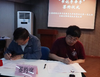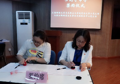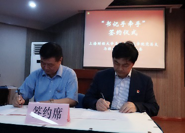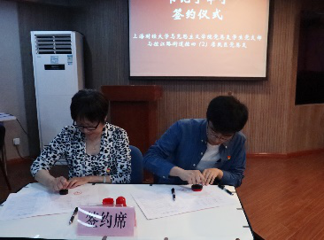 第三个环节:上海财经大学马克思主义学院党总支、党总支第一支部、党总支第二支部、党总支学生党支部的负责人分别与控江路街道党工委、控江路街道机关党支部、控江路街道社区事务受理服务中心党支部、控江路街道控四(2)居民区党总支的负责人,成功举行了“书记手牵手”的签约仪式。