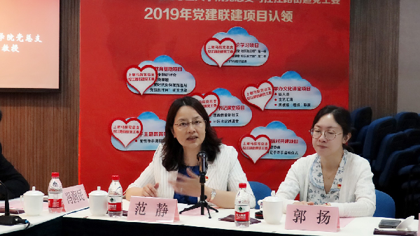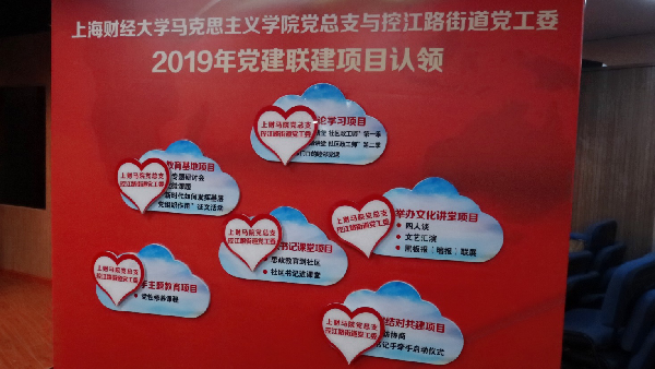 第四个环节:上海财经大学马克思主义学院党总支与控江路街道党工委的双方领导就“开展理论学习”、“举办文化讲堂”、“支部结对共建”、“社区书记课堂”、“深化教育基地”、“手牵手主题教育”成功举行了党建联建6大项目的认领仪式。