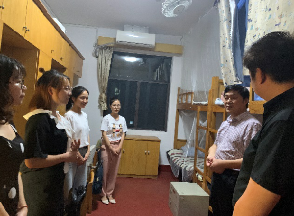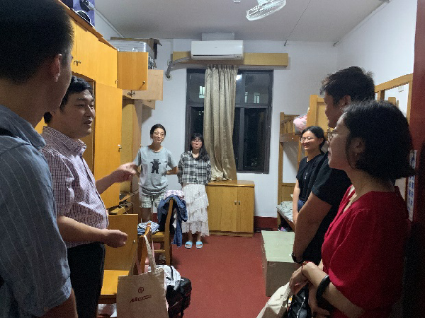 随后,老师们来到了8号楼看望硕士班女生。同学们看到老师们的到来感到既开心又温暖。老师们向同学逐一询问了每个人本科阶段的学习情况和研究生阶段的规划打算,为大家答疑解惑。在其中的一间寝室里,恰好遇见了正在帮忙整理寝室的学生家长,与家长亲切地交谈,学生家长也对学院的关心表示感谢并从家长的角度谈了谈子女研究生从备考到入学的感受和体会。