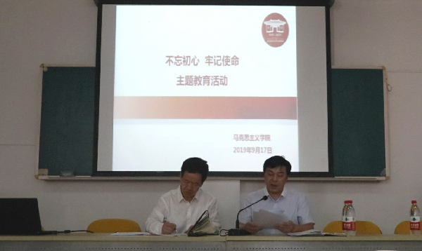2019年9月17日中午,马克思主义学院于国定路行政大楼一楼会议室召开“不忘初心,牢记使命”主题教育动员会,学院全体教师党员,思政课教师及学生党员参加会议,会议由党支部书记郝云主持。