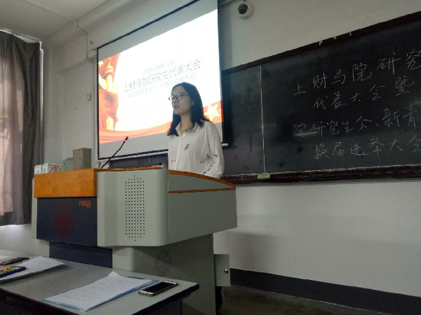 本次会议还邀请到上海财经大学校研究生会主席团代表赵宇阳,赵宇阳学姐从活动组织的角度来和大家分享了自己的经验和心得。她提出了“责任感”是组织活动的核心,学生组织应该树立对学校、对学院、对同学的责任心,更应该发挥好在老师和同学间的纽带作用。