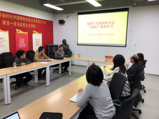 2019年11月12日,马克思主义学院教工第一党支部以党的十九届四中全会《中共中央关于坚持和完善中国特色社会主义制度、推进国家治理体系和治理能力现代化若干重大问题的决定》为主题的党课,党课由马克思主义学院教工第一党支部书记龚剑老师主讲。