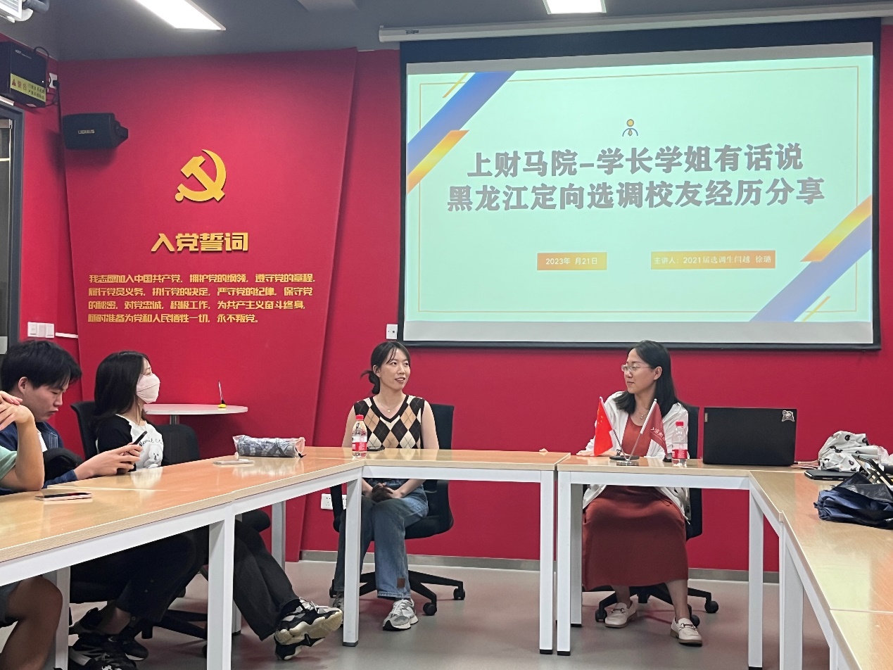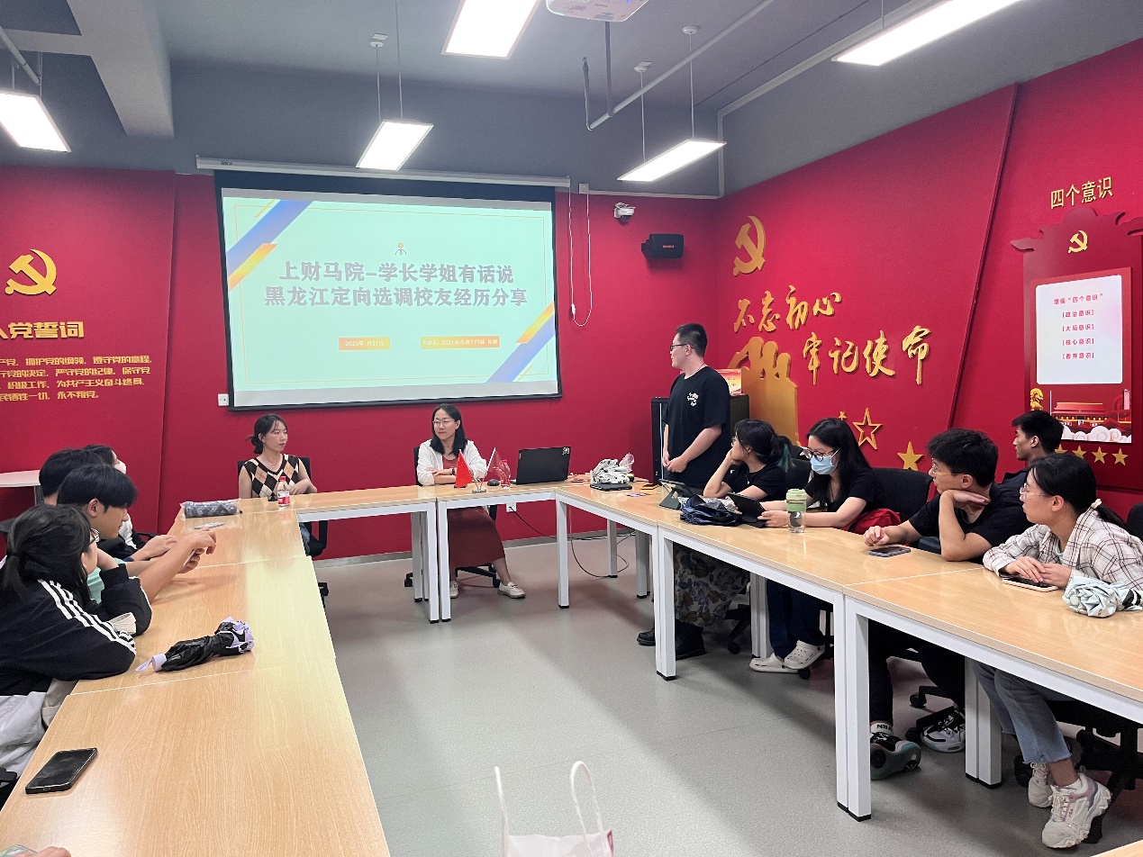 2023年9月21日,上海财经大学马克思主义学院研会举办了第九期“学长学姐有话说”系列涯海沙龙。本期分享活动的主题是定向选调经验分享,邀请到的嘉宾是21届黑龙江定向选调生闫越与徐璐学姐,现分别就职于黑龙江平房区司法局与市场监督管理局。