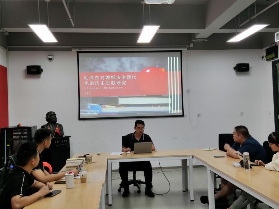 上海财经大学马克思主义学院博士研究生屈甲茂以毛泽东对婚姻法治现代化的历史贡献研究为题进行了分享。他利用跨专业优势,将法律与中国式现代化相结合,以毛泽东对婚姻法治现代化的贡献为出发点,分析了毛泽东在婚姻法治思想上反对封建婚姻制度,坚持婚姻自由原则,坚持男女平等,注重保护妇女儿童利益等四个方面的现代性特征,体现了对我国婚姻法治现代化发展的重要作用。屈甲茂同学的选题角度新颖,内容丰富,他的分享为我们阅读原著和论文写作提供了新的思路。