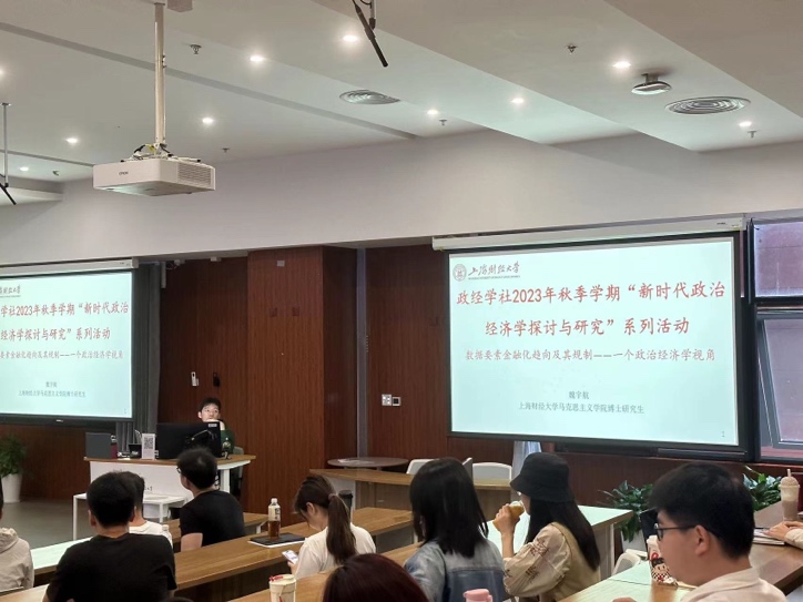 2023年10月24日下午三点,政治经济学学社开展了本学期第二次常规活动,上海财经大学马克思主义学院当代马克思主义经济理论博士研究生、政治经济学学社社长魏宇航在科研楼B115会议室为同学们做了学术报告,主题为“数据要素金融化趋向及其规制——一个政治经济学视角”,政治经济学学社社员、马克思主义学院学生参加了本次活动。