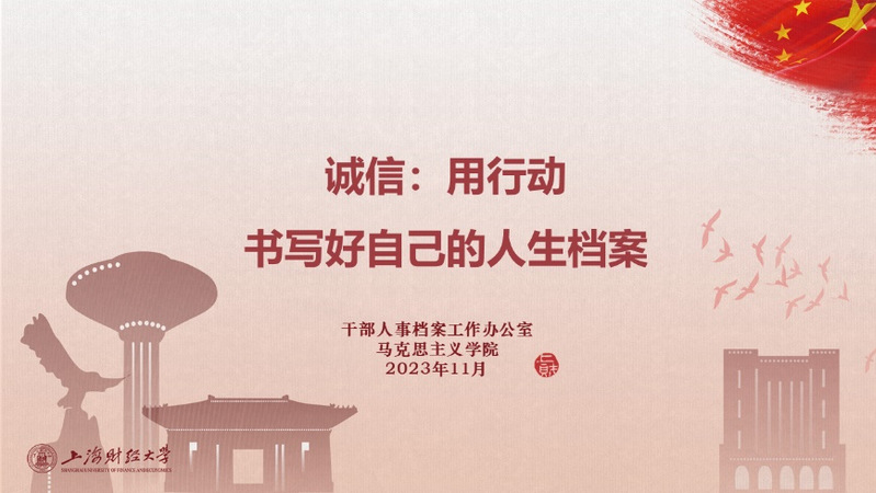 为深入学习贯彻习近平文化思想,稳步推进《上海财经大学思想政治理论课综合改革方案3.0》具体实施,2023年11月13日至11月23日,上海财经大学马克思主义学院《思想道德与法治》教研室与我校干部人事档案工作办公室,将人事档案与诚信教育相结合,联合举办了以“诚信:用行动书写好自己的人生档案”为主题的SUFE大思政课,有效地将“档案诚信教育”融入进《思想道德与法治》课堂。