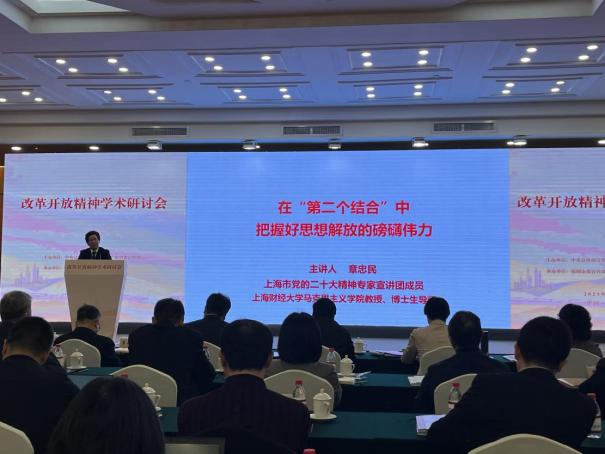 上海财经大学马克思主义学院章忠民教授应邀参会,并作题为《在“第二个结合”中把握好思想解放的磅礴伟力》的会议发言。章忠民教授围绕以下几个方面展开论述:第一,“第二个结合”作为又一次的思想解放,从根本上讲,其意涵在于用马克思主义激活中华文明,促使二者在相互契合的基础上得以互相成就,朝向于构建人类文明新形态。今年是我国改革开放45周年,对于研究、弘扬改革开放精神具有重大的理论和实践意义。思想解放是改革开放精神的核心,同时习近平总书记在今年将“第二个结合”作为又一次的思想解放,这就促使解放思想成为加强二者融合研究的聚焦点。因此,必须立足改革开放的大背景,明确每一次的思想解放重在解决的问题,从问题中探寻思想解放的深刻意蕴。第二,正确认识思想解放在社会变革中的先导作用,这是我们理解“第二个结合”的前提所在。其一,思想解放是贯穿社会变革的一条主线,社会变革离不开思想解放。思想解放有狭义和广义之分,“第二个结合”作为又一次的思想解放是要为推进中国共产党领导下的社会主义现代化建设打开广阔的思想空间,彰显社会主义的先进优势。其二,思想解放对我国社会主义发展的整体历程总是起到先导作用。因此,推进全面深化改革,必须深刻把握问题导向、不断推进思想解放。其三,在问题导向中把握思想解放的发展逻辑,就会发现推进思想解放的步伐与中华民族站起来、富起来到强起来的发展逻辑紧密结合。第三,深刻把握推进思想解放中关键性的辩证关系,这是我们把握“第二个结合”的精髓所在。思想解放就是要破除旧思想、创立新思想,在这一过程中必然会遇到各种问题的争论,需要处理好各种关系。欲求“第二个结合”这一思想解放之成功,需要认清“第二个结合”要解决什么样的问题,由此必须着力回答好“体”与“用”、传统与现代、中国与外国、理论与实践以及“破”与“立”这些关键性的关系。第四,提炼把握中国共产党推进思想解放的经验规律,这是我们推进“第二个结合”的关键所在。“第二个结合”作为又一次新的思想解放,开辟了中国共产党推进思想解放的新境界。在应对解决问题中不断发展,在发展中问题不断涌现。做好规律性总结和提炼,有助于我们把握历史主动并为进一步的思想解放做好充分准备,因而必须把握以下五个方面:坚持理论创新是推进思想解放的基本前提、坚决反对历史虚无主义是推进思想解放的重要原则、坚持人民至上是推进思想解放的价值指向、坚持胸怀天下是推进思想解放的应有之义、坚持“两个结合”是推进思想解放的根本遵循。