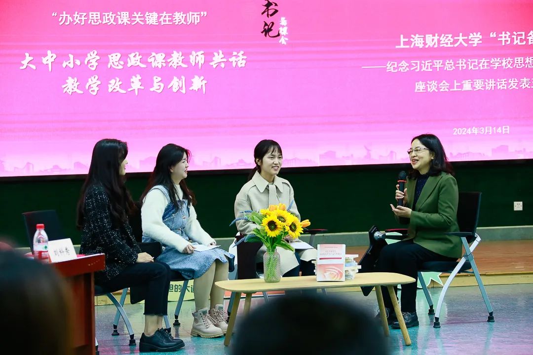 自由发言环节,上海财经大学附属杨浦区国安路小学党支部书记吴燕蓓、德育主任叶楠,上海财经大学附属中学政治教研组长孙世英、政治教师刘馨遥,上海财经大学附属初级中学道法教师黄莉涵都围绕“3.18”重要讲话精神,并结合自身工作经验深入研讨了如何让思政课成为一门有温度的课。