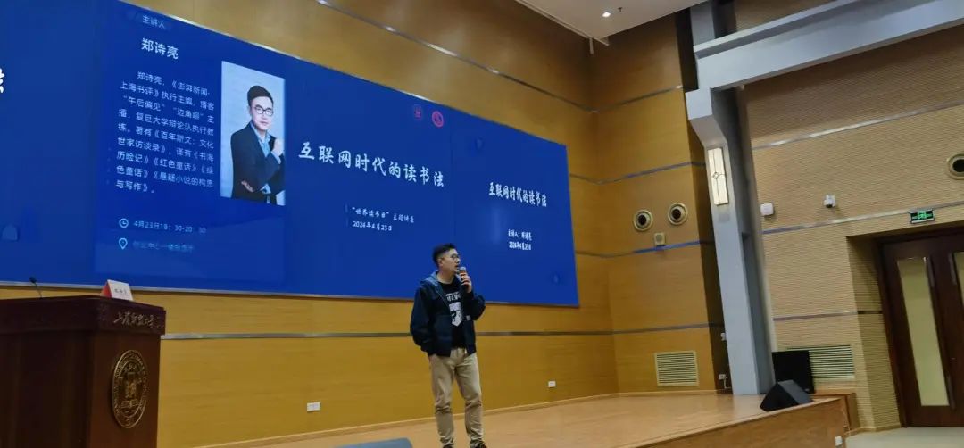 最是书香能宜人。阅读是人类进步的阶梯,随着互联网时代信息技术的快速发展,大学生阅读内容和阅读形式也在发生快速的变化。为让财大的同学们进一步了解在互联网时代,应该怎样读书、读书的意义何在,在第29个世界读书日,应马克思主义学院邀请,《澎湃新闻·上海书评》执行主编、播客“午后偏见”“边角聊”主播,复旦大学辩论队执行教练郑诗亮做以“互联网时代的读书法”为主题作报告。100多名学生现场聆听了报告,校党委常委、宣传部部长、马克思主义学院党委书记曹东勃教授主持报告并作总结。