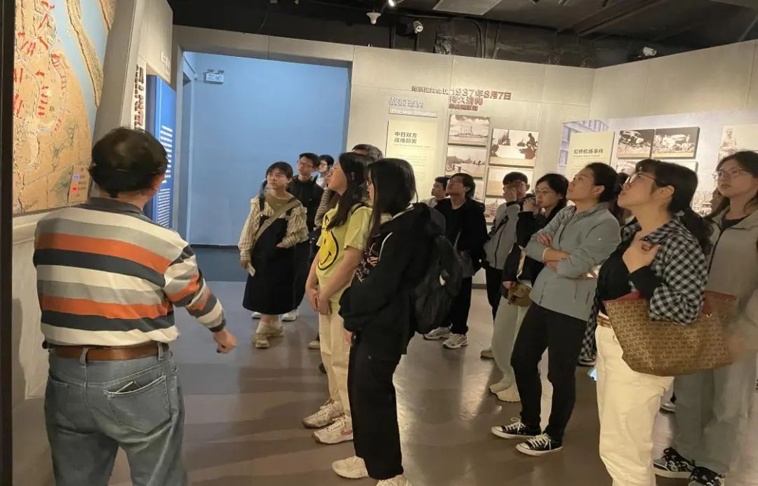本次实践教学活动的最后一站,是位于宝山区友谊路的淞沪抗战纪念馆。一进入馆中,同学们就被庄重肃穆的气氛所感染,馆中第一部分是《血沃淞沪——淞沪会战主题展》,展内由“中国抗日战争的爆发”、“八一三淞沪会战”、“上海抗日救亡运动的高潮”等七个部分组成,内部陈列着大量抗战时期的照片、实物和文献。这些文物不仅生动再现了当年淞沪会战的激烈场景,而且直观地展现了抗战时期人民的苦难与坚韧。同学们结合课堂刚刚学习过的内容,认真聆听讲解,驻足仔细观看,还不时就感兴趣的内容相互交流。一位同学还拿着刚拍摄的文史照片,对韩老师感慨,他们当初解放上海、接管上海时都那么年轻。通过参观真切地理解了全民族抗战中的血战到底、视死如归的抗战精神,也明白了为什么抗战胜利能够成为中华民族伟大复兴的历史转折点。