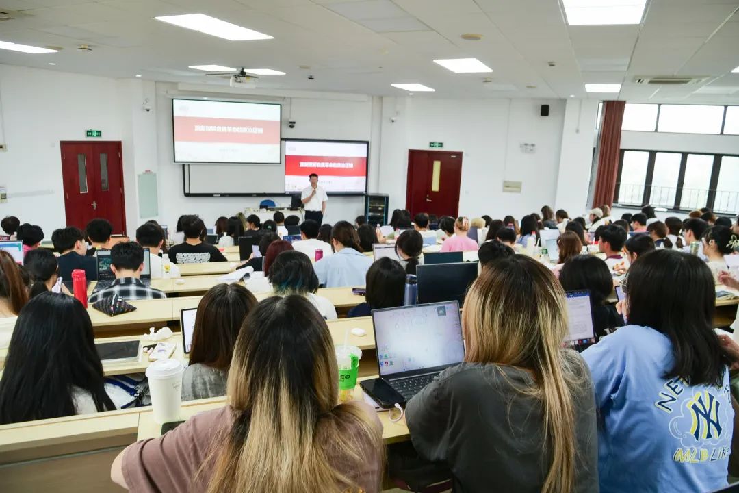 通过回顾我国改革开放历程,不难发现,金融建设始终是党和国家发展的重要工作之一。随后,刘莉亚老师走上讲台,以“点绿成金,写好‘绿色金融’大文章”为主题,把同学们的思绪从“历史”引入“现实”。结合2024《政府工作报告》《关于进一步强化金融支持绿色低碳发展的指导意见》等重要政策文件,同时通过介绍绿色信贷、资本监管的绿色缺陷、绿色债券、碳金融、生物多样性金融等丰富的金融实践案例,刘莉亚老师从“绿色成为新质生产力的底色”“绿色金融发展面临的关键问题”“政策协调配合支持绿色发展”三大方面,强调金融是国民经济的血脉,可以起到与政府财政投入互补的作用,绿色金融可以和财政支持手段协调配合共同推动经济社会可持续发展,由此引导同学们了解最新的理论成果,丰富拓展学习维度。最后,刘莉亚老师鼓励同学们把专业学习、职业选择、人生理想与党和国家的重大战略相结合。
