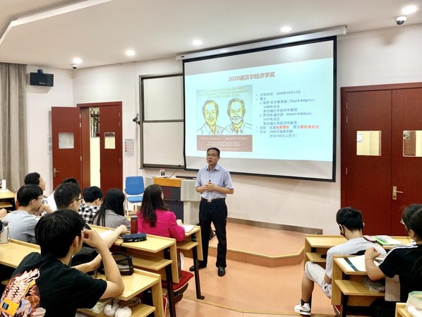 徐飞副校长把诺贝尔学奖的缘起、历次华人获奖情况娓娓道来,以此引出2020年诺贝尓经济学奖的获得者保罗·米尔格罗姆和罗伯特·威尔逊在“用于改进拍卖理论和新拍卖形式”方面作出的贡献。就他们提出的新拍卖形式,依次给同学们介绍了四种拍卖机制,分别是公开增价拍卖(英格兰式拍卖)、公开降价拍卖(荷兰式拍卖)、密封一价拍卖和密封二价拍卖(维克瑞拍卖)。