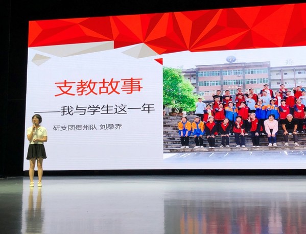 支教队员唐利同学首先分享了她的支教经历。在遵义市道真仡佬族苗族自治县玉溪中学任教的她谈及支教生活,依旧难忘那激情燃烧的支教生活。为了更好地融入学生群体,她踏遍了学校周围每一寸土地,领略了当地的风土人情,目睹了孩子们求学的不易与艰辛,也感受到了自己到此的任务与使命。在这一年里,她完成了从学生到老师的角色转变,与孩子们共同成长,共同学习。她讲到,支教的条件虽然很艰苦,但在收到学生们送的贺卡时,却觉得内心无比的幸福与充实。