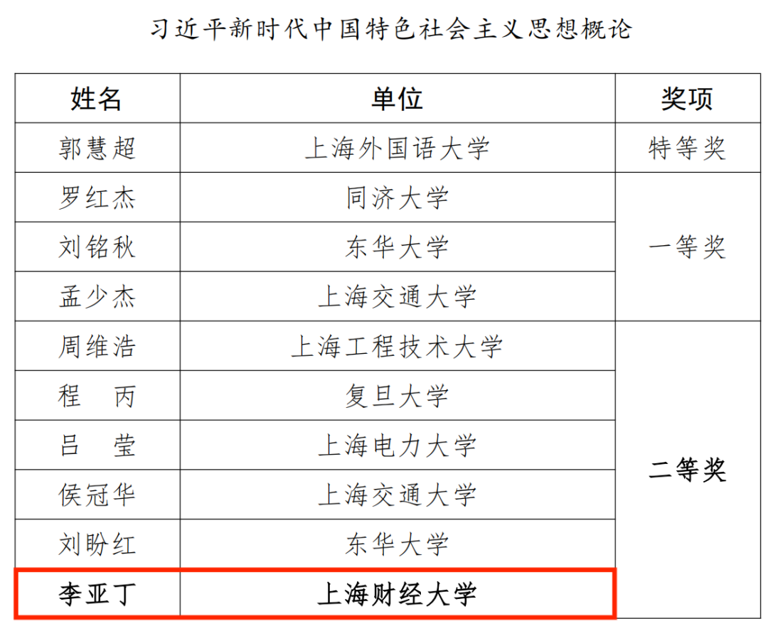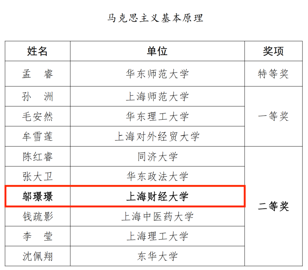 近日,“讲台上的新思想”——2024年上海高校思政课教师教学大比武暨教学展示活动获奖名单公示,上海财经大学马克思主义学院获得佳绩。