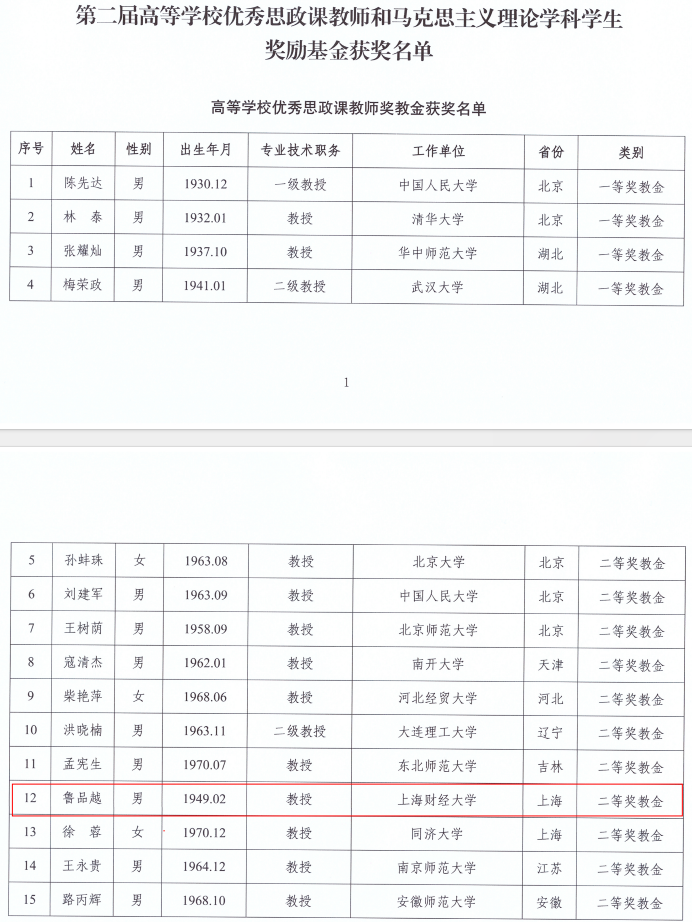 我院鲁品越教授荣获高等学校优秀思政课教师奖二等奖教金。