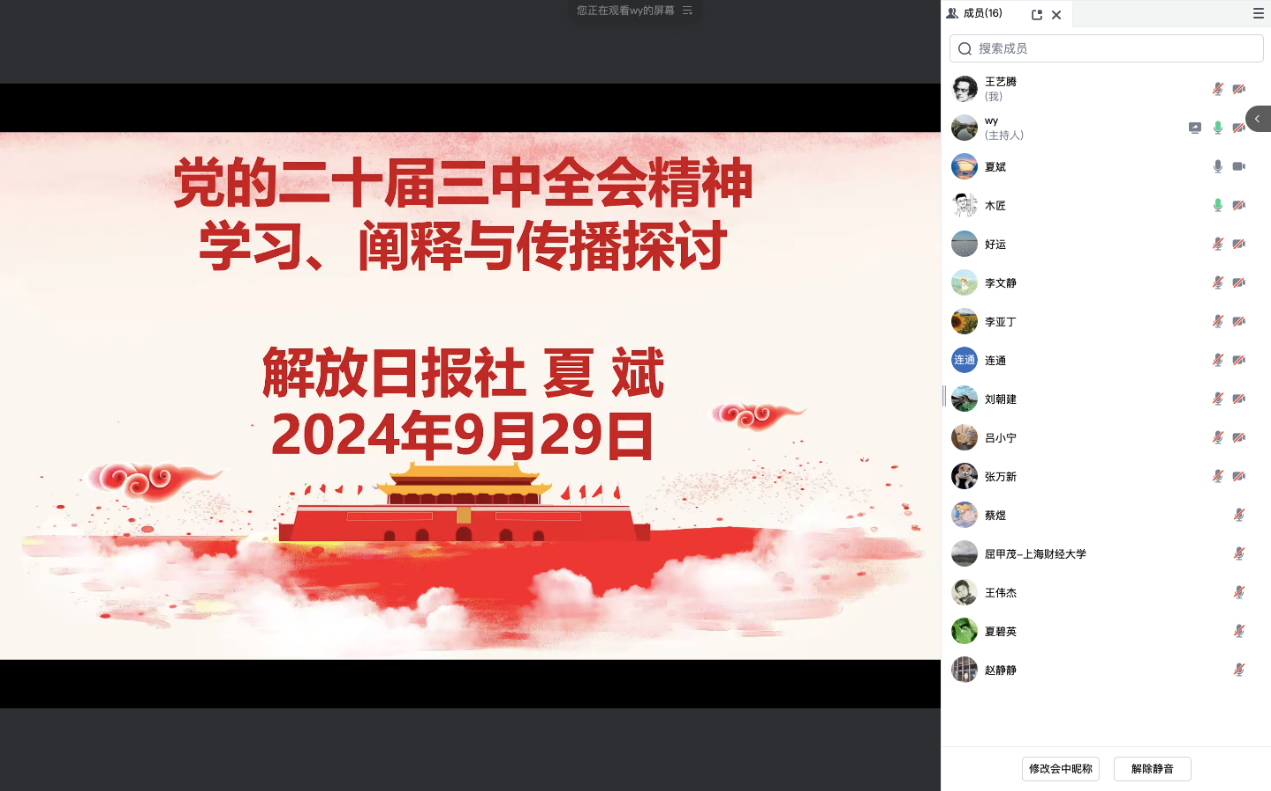 为进一步推动支部师生党员对党的二十届三中全会精神的学习贯彻,深入做好理论宣传解读和学理阐释工作,9月29日晚,马克思主义中国化研究师生联合党支部成功组织一场线上专题研讨活动。此次活动特别邀请到《解放日报》专业首席编辑、《思想周刊》主任编辑夏斌老师,作《党的二十届三中全会精神学习、阐释与传播探讨》的专题分享。活动由支部书记王岩老师主持,支部党员参加学习并进行交流研讨。