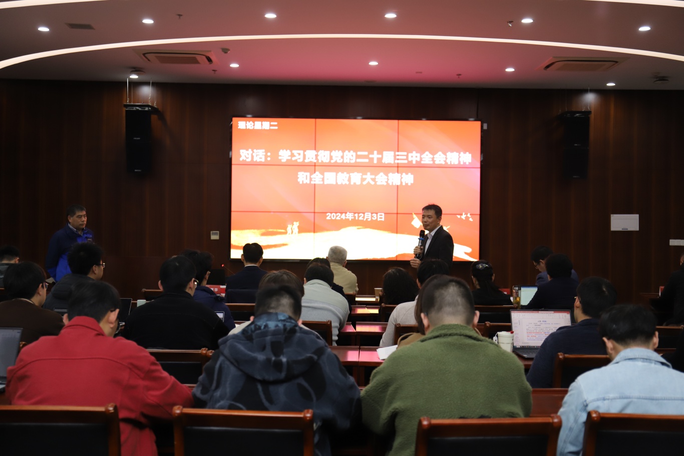2024年12月3日,上海财经大学马克思主义学院与经济学院-联合举办了专家解读二十大三中全会精神暨中心组联学会议。此次会议由经济学院党委委员、副院长冒佩华主持,两院师生党员参与学习。