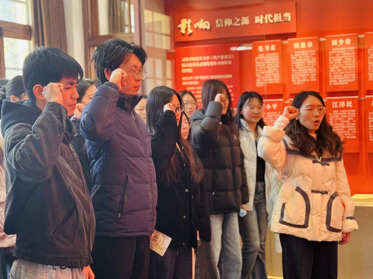 在参观活动的最后,上海财经大学马克思主义学院的学生们在共产党宣言展示馆前,重温入党誓词,坚定初心使命。面向党旗,庄严举起右拳,集体重温入党誓词。铮铮誓言在展馆内回响,表达了新时代青年对党的忠诚和为共产主义事业奋斗终身的坚定信念。这一刻,不仅是一次誓言的重温,更是一场灵魂的洗礼,让每一位在场的学生更加坚定了自己的理想信念,牢记共产党员的初心和使命。