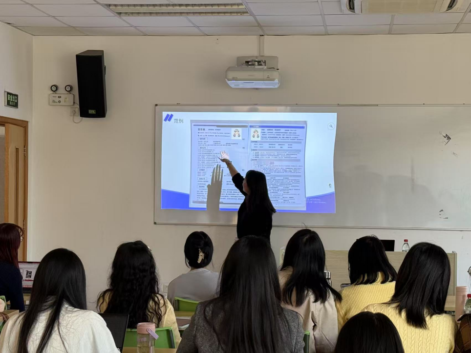 在讲座的1V1环节,殷老师逐一查看了同学们提交的简历,从格式规范、措辞表达、内容层次等多个维度提出中肯建议。她指出,不少同学在内容准备上已有一定基础,但仍存在“求职意向模糊”“经历描述空泛”“亮点不突出”等问题。通过现场个性化指导,大家对如何打造一份真正有竞争力的“目标导向型”简历有了更深刻的理解。