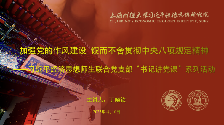 2025年4月10日下午,习近平经济思想师生联合党支部成功举办了一场别开生面的“书记讲党课”系列活动。本次党课由上海财经大学习近平经济思想研究院副院长、马克思主义学院副院长(主持工作)、习近平经济思想师生联合党支部书记丁晓钦教授主讲,主题为“加强党的作风建设,锲而不舍贯彻中央八项规定精神”。丁晓钦书记作为上海财经大学的讲席教授,以其深厚的学术功底和丰富的实践经验,为在场的师生党员带来了一场深刻而生动的党课。