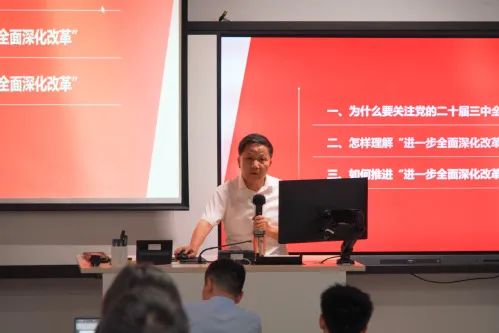 随后,陈信元副校长从“为什么要关注党的二十届三中全会”“怎样理解‘进一步全面深化改革’”“如何推进‘进一步全面深化改革’”三个方面作了精彩解读阐释。陈信元老师以自身参加高考、进入上财学习、工作几十年的感受入手,如数家珍地将上海在改革开放过程中发生的巨大变化娓娓道来,事实表明,改革开放是我们应对各种困难和挑战、取得一切成功和进步的一大法宝、关键一招,面对有效需求不足、部分行业产能过剩、社会预期偏弱、风险隐患仍然较多,国内大循环存在堵点,外部环境的复杂性、严峻性、不确定性上升等新问题新挑战,我们仍然需要进一步全面深化改革。而进一步全面深化改革,就需要特别注重改革目标的总体性、改革领域的全面性、改革机制的系统性。坚持问题导向,深度优化体制机制;坚持以人民为中心,激发社会活力;坚持对外开放,发展新质生产力。