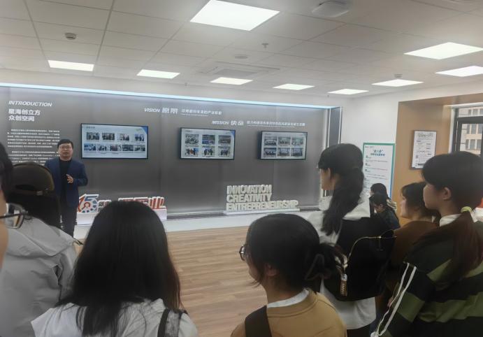 最后一个环节,实践教学团队来到星海创立方众创空间。同学们了解到,星海创立方众创空间与社区、高校紧密联系,旨在提供就业、为企业创业的前期做铺路帮扶工作等。免费的水电网暖、专业的创业辅助专家、几乎免费的公共办公室等等无一不体现出奉贤区政府与高校对于数字经济创新创业人才的高度重视,据主讲人介绍当前的很多正在基地创业中的公司都将数字信息技术和企业产品服务进行结合,体现了当下数字经济逐渐成为国家经济发展的重心和热点。