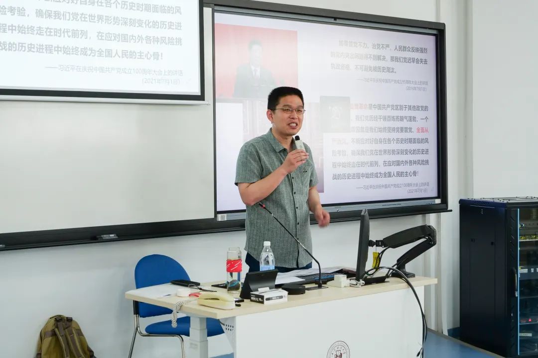 6月12日下午,校党委副书记、纪委书记何鹏程老师走进《习近平新时代中国特色社会主义思想概论》课堂,与马克思主义学院教师姜国敏共同讲授课程最后一章《全面从严治党》。