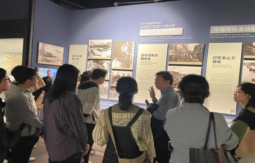 本次实践教学活动的最后一站,是位于宝山区友谊路的淞沪抗战纪念馆。一进入馆中,同学们就被庄重肃穆的气氛所感染,馆中第一部分是《血沃淞沪——淞沪会战主题展》,展内由“中国抗日战争的爆发”、“八一三淞沪会战”、“上海抗日救亡运动的高潮”等七个部分组成,内部陈列着大量抗战时期的照片、实物和文献。这些文物不仅生动再现了当年淞沪会战的激烈场景,而且直观地展现了抗战时期人民的苦难与坚韧。同学们结合课堂刚刚学习过的内容,认真聆听讲解,驻足仔细观看,还不时就感兴趣的内容相互交流。一位同学还拿着刚拍摄的文史照片,对韩老师感慨,他们当初解放上海、接管上海时都那么年轻。通过参观真切地理解了全民族抗战中的血战到底、视死如归的抗战精神,也明白了为什么抗战胜利能够成为中华民族伟大复兴的历史转折点。