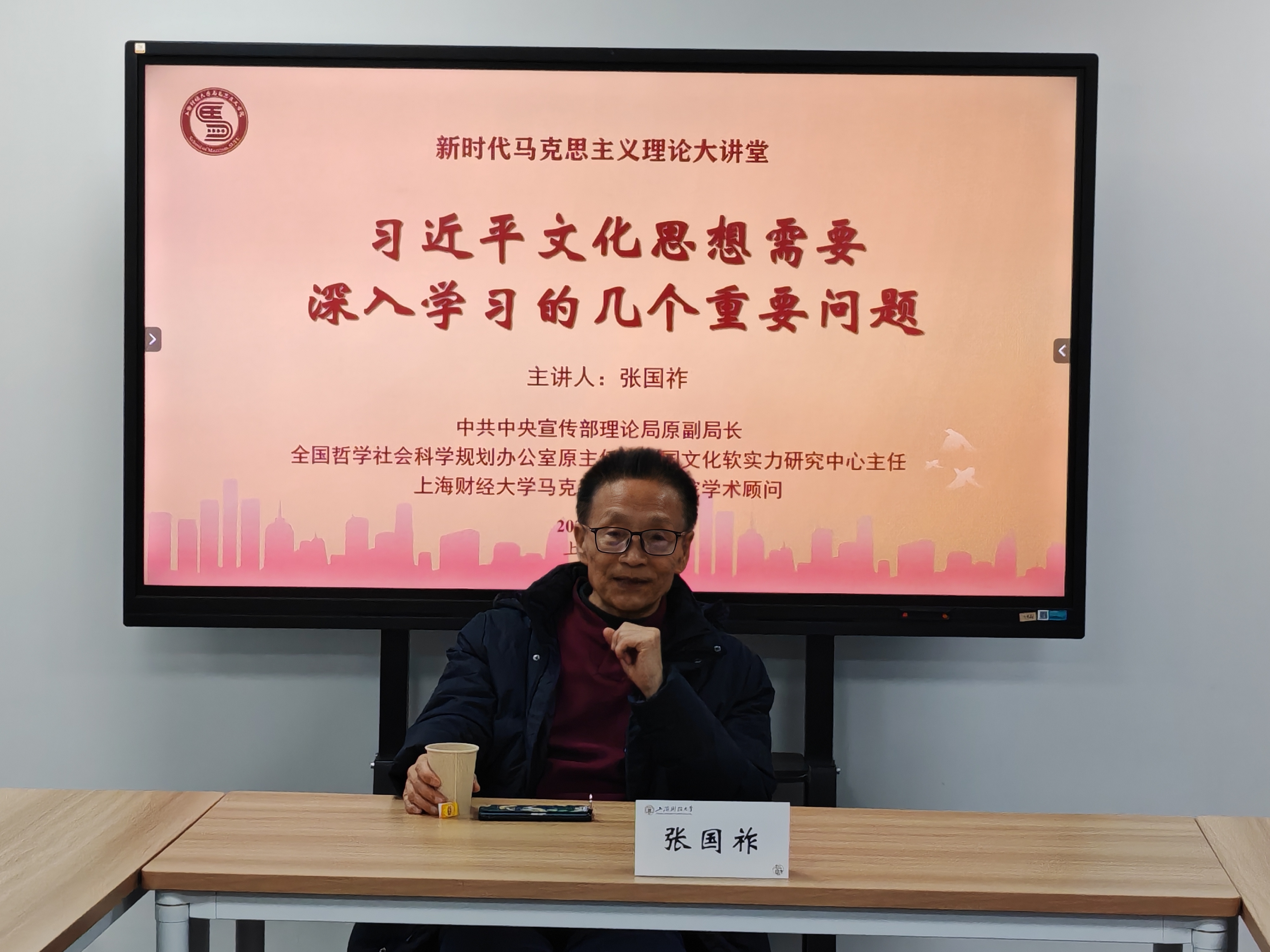 为深入学习贯彻党的二十届四中全会精神,进一步把握习近平文化思想的核心要义及其内在逻辑,2026年1月17日上午,中共中央宣传部理论局原副局长、全国哲学社会科学规划办公室原主任、中国文化软实力研究中心主任、上海财经大学马克思主义研究院学术顾问张国祚教授应邀作为“习近平文化思想需要深入学习的几个重要问题”的专题讲座。讲座由马克思主义学院姚黎明副教授主持。