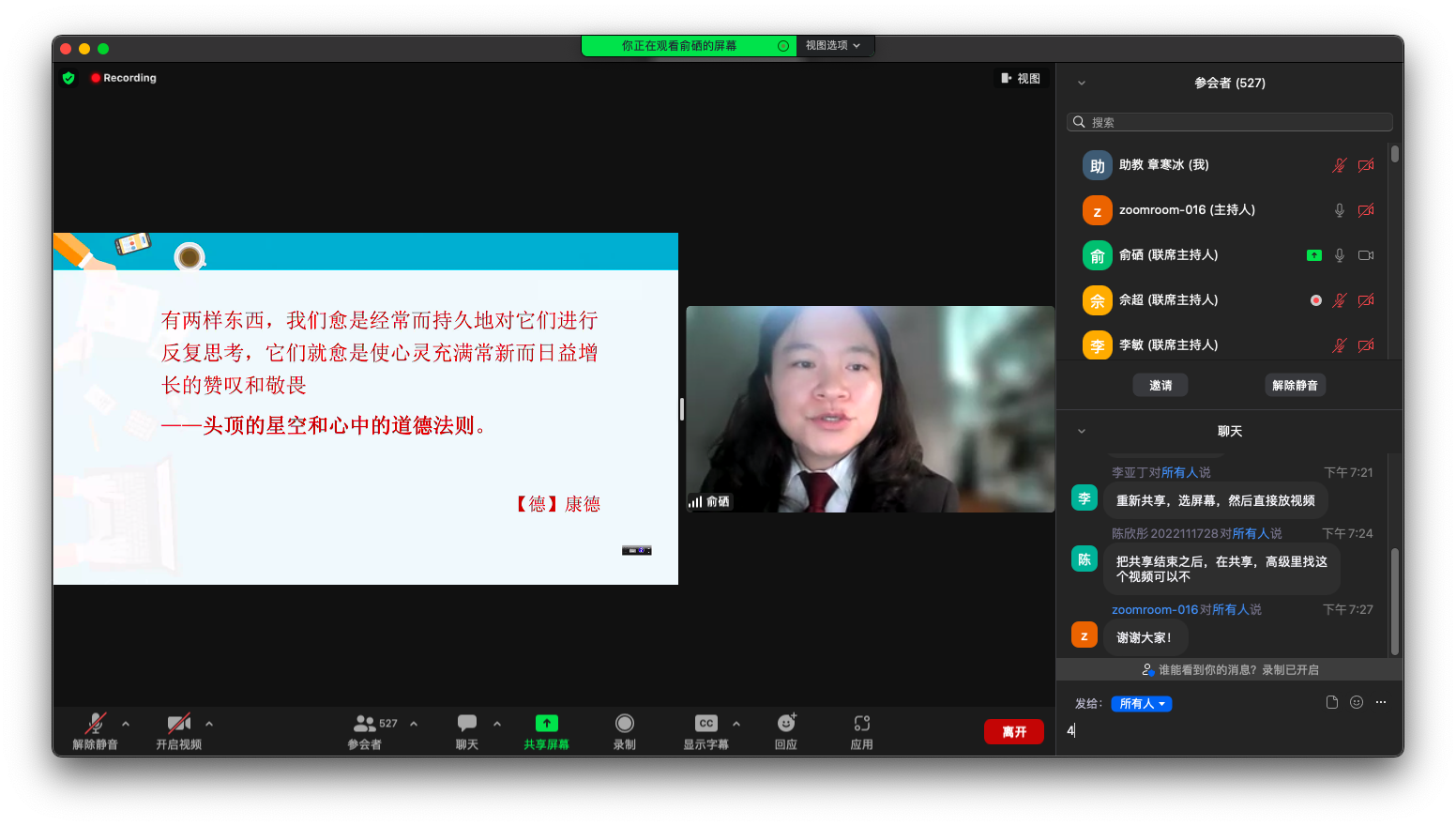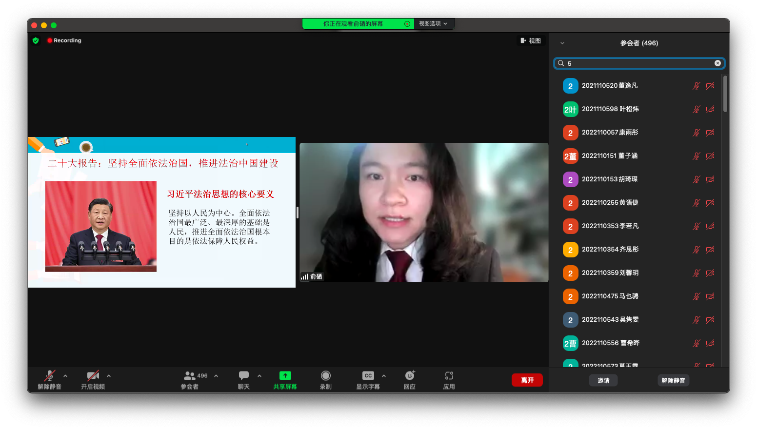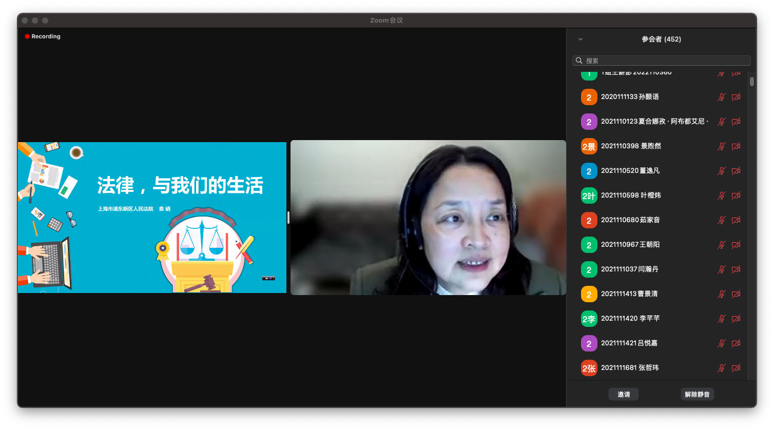 上海财经大学马克思主义学院《思想道德修养与法律基础》教研室主任范静老师主持了本次主题大课,上海市浦东新区人民法院俞硒法官担任主题大课的主讲嘉宾,上海财经大学思修教研室全体教师、大一新生共计1000余人参与学习了本次思政主题大课。