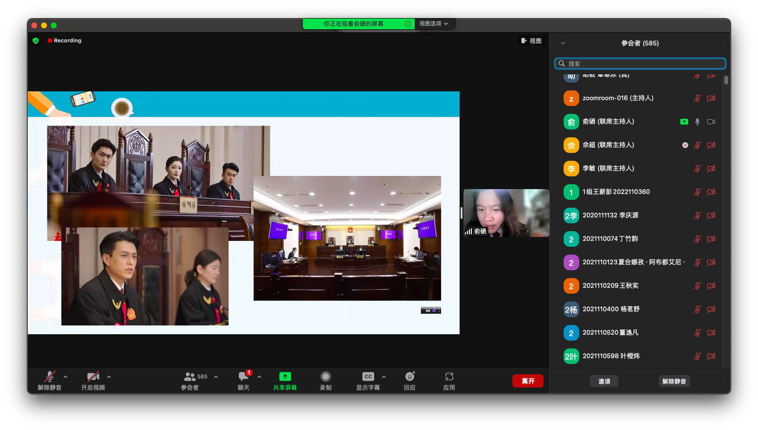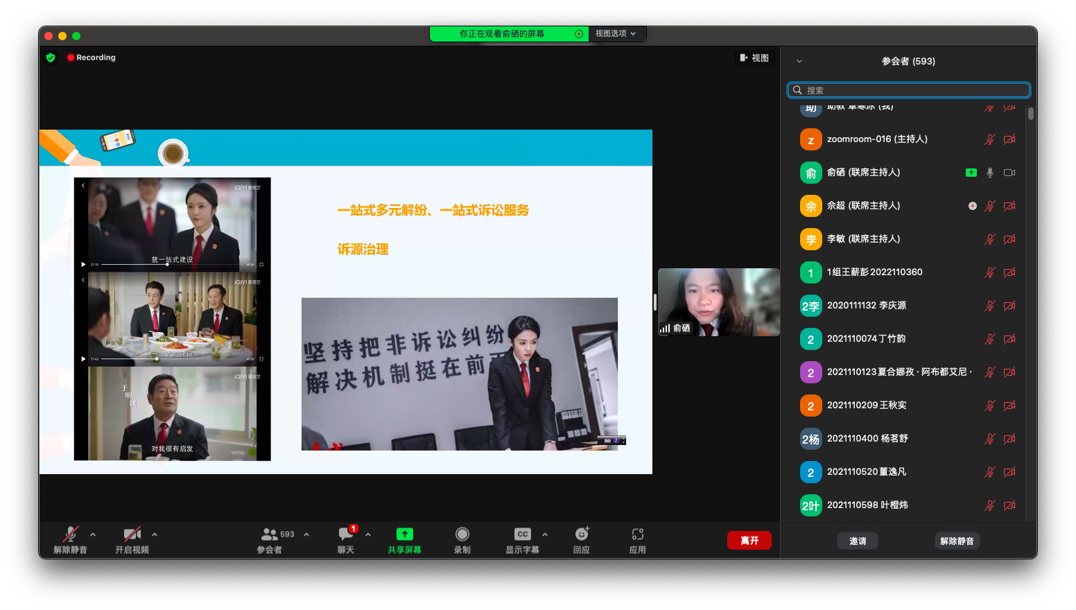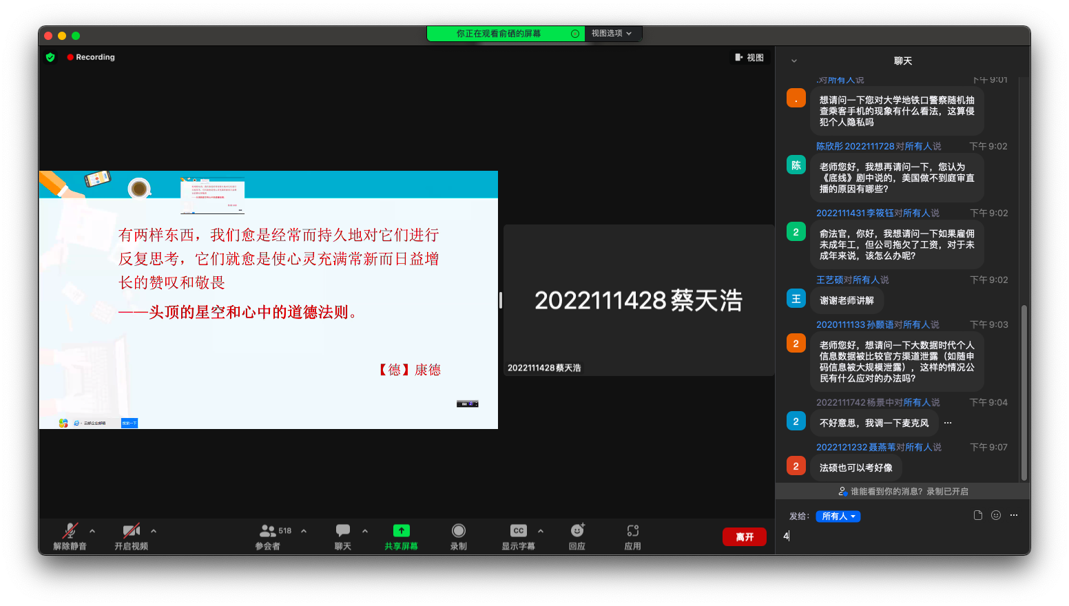 之后,俞硒法官与大一新生们进行了热烈的互动。同学们结合时事热点和自己的兴趣向俞法官提出了自己的疑问,对于同学们关于线上庭审的具体操作、非法律专业从事法律行业的方式、中西方法庭的格局差异、选择法学的初衷、实习是否应该发放工资等问题,俞法官都一一进行了细致解答。经过学习与互动,同学们更好的认识到提升法治思维的重要性。