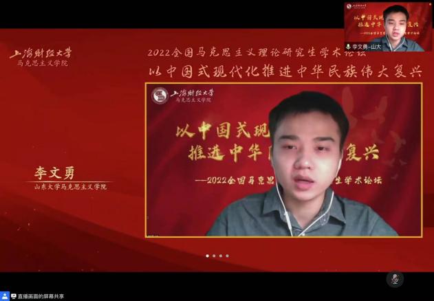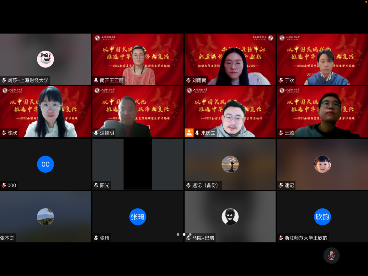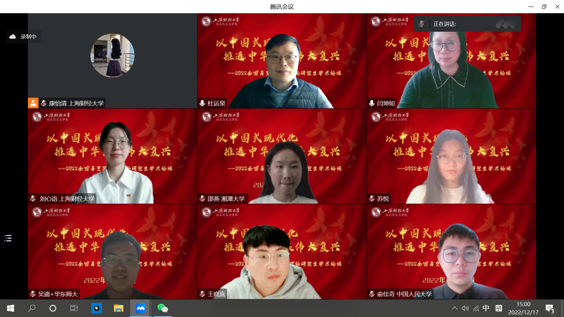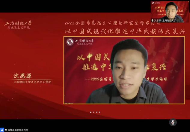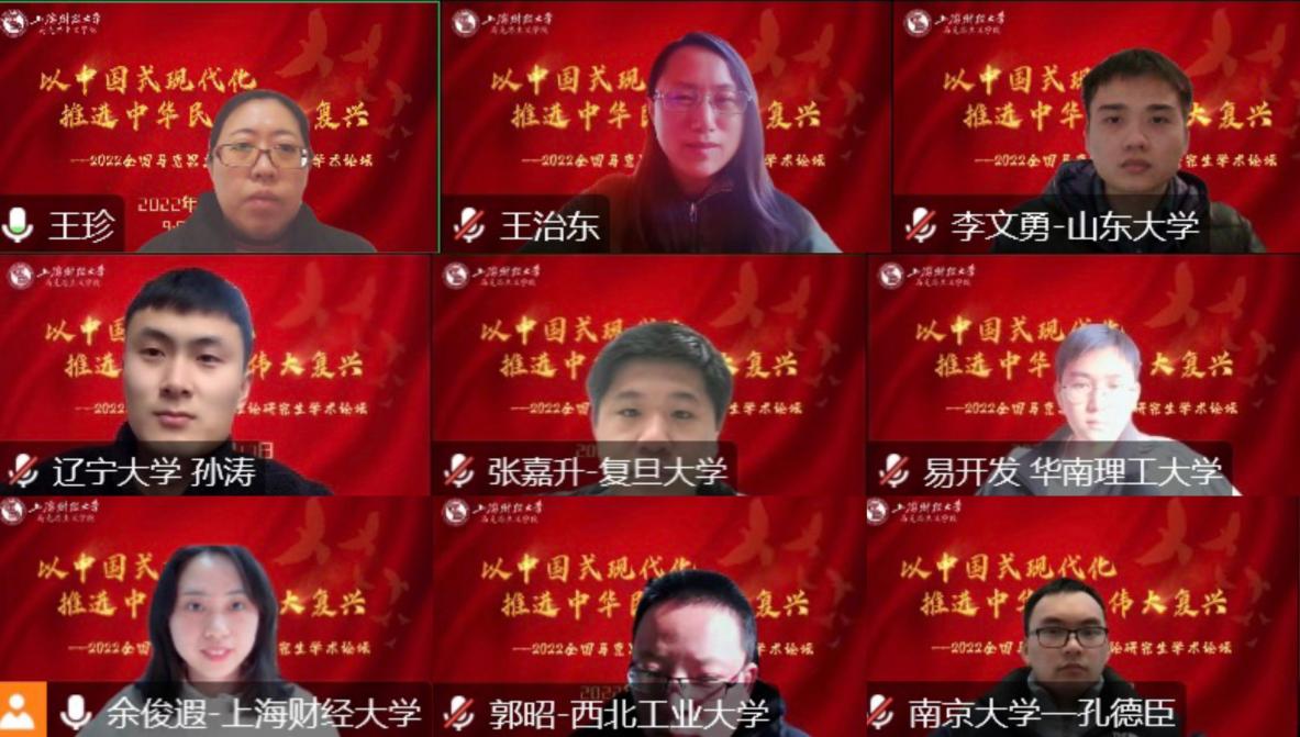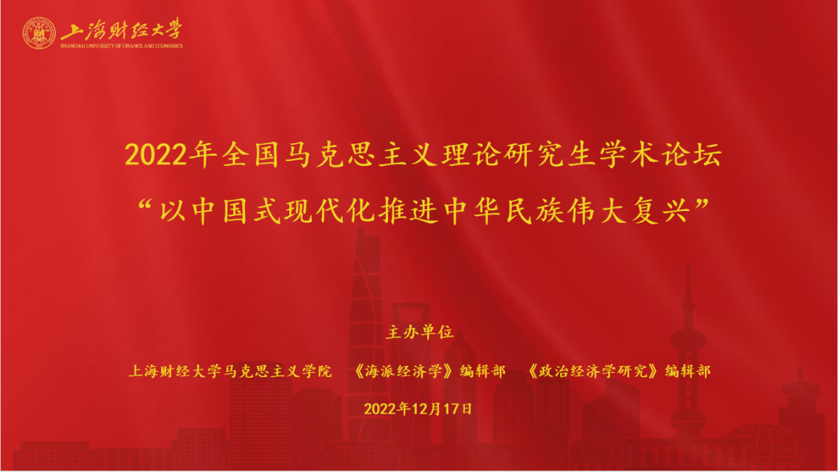 2022年12月17日,由上海财经大学马克思主义学院与《海派经济学》《政治经济学研究》编辑部联合举办的“2022年全国马克思主义研究生学术论坛‘以中国式现代化推进中华民族伟大复兴’”在云端成功举行。来自复旦大学、中国人民大学、上海交通大学、华东师范大学、浙江大学、山东大学、南京大学、中共中央党校、上海财经大学等单位的师生参会。会议以腾讯会议与直播的形式进行,近2000人次收看了会议。