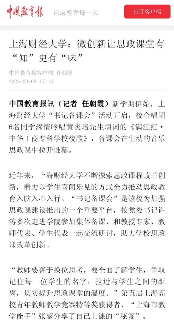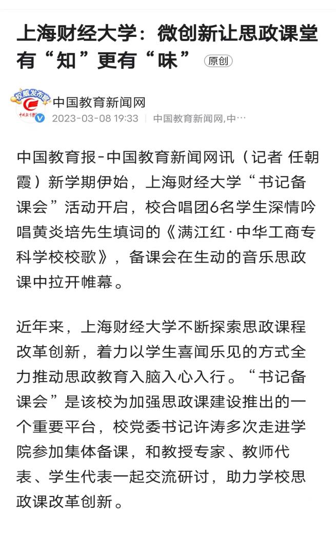 春日向暖,万物勃发。马克思主义学院持续深入推进思政课改革,另辟蹊径,推陈出新。近日,我院思政课教改微创新被中国教育报、中国青年报、青年报、劳动报、新闻晨报等多家媒体关注和广泛报道。