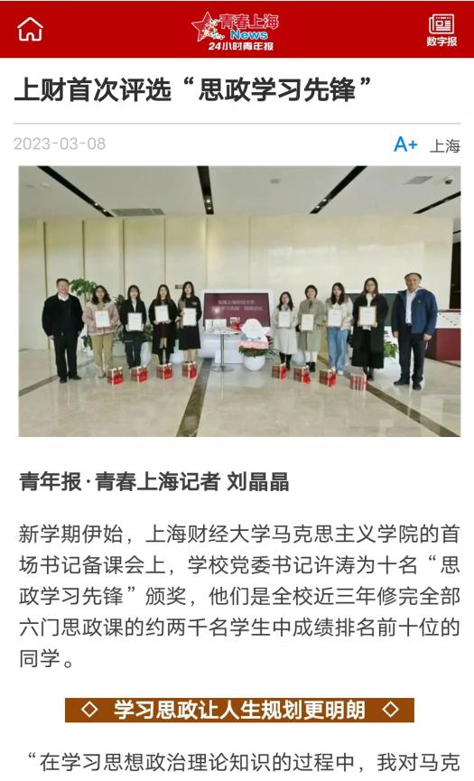 “在学习思想政治理论知识的过程中,我对马克思主义基本原理和中国特色社会主义理论有了更为深入的学习,对国内外复杂的国际形势和当下时事热点有了更为清晰的认知。尤其是在思政课的教学实践中,我逐渐认清了当代大学生所应肩负的使命和担当。思想领域的不断清明使得我将思政课的所学所思刻画在心中,并在潜移默化之中内化为自身的发展动力和前进方向。”这是在上海财经大学举行的首届“思政学习先锋”颁奖仪式上,来自公共经济与管理学院20级投资学2班的罗雅鑫同学的分享。