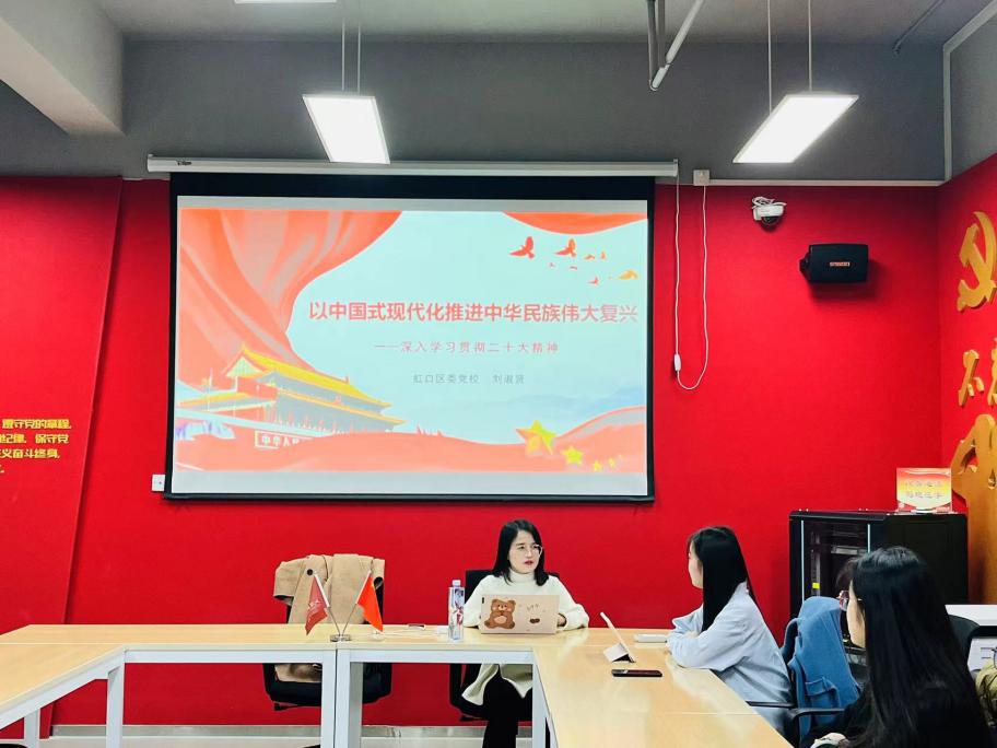 2023年4月4日下午,上海财经大学马克思主义学院新时代青年研习社于科研实验大楼1318室举办“迈向新征程,青年勇担当”系列活动之中国式现代化学习交流会。本次活动邀请到上海市虹口区委党校讲师、上海财经大学马克思主义学院马克思主义基本原理专业2020届毕业生刘淑贤老师作“以中国式现代化推进中华民族伟大复兴”为主题的交流分享,本次活动由新青社副社长姚静晋主持。