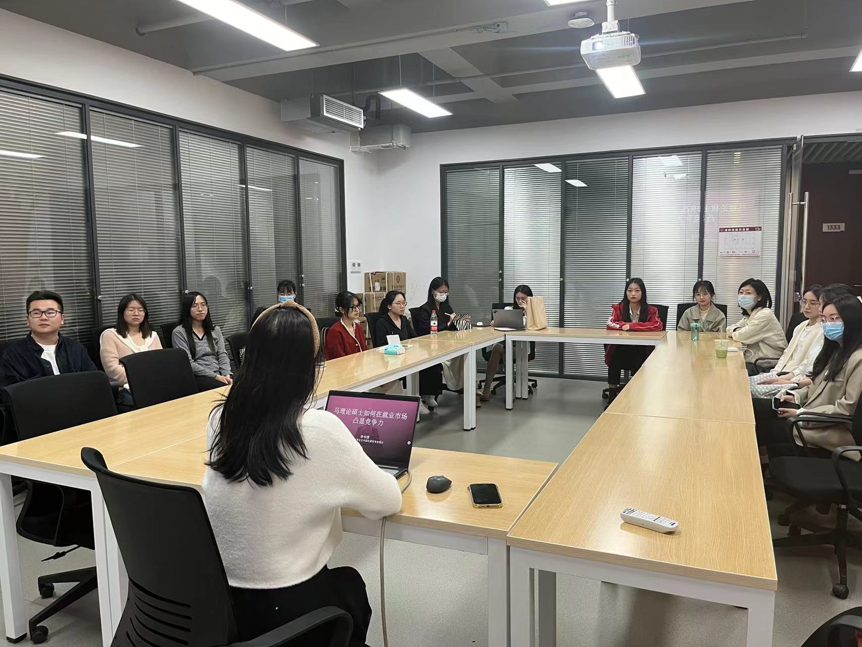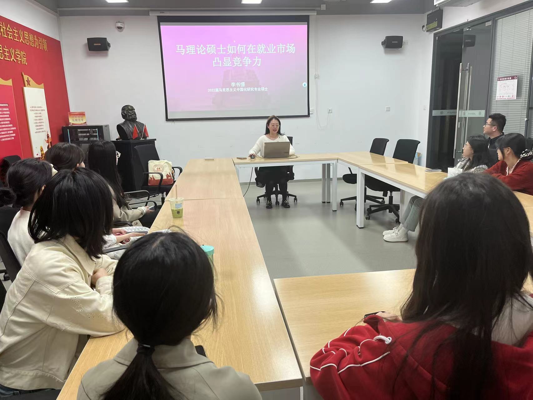 李书憬学姐以“马理论硕士如何在就业市场凸显竞争力”为主题向我们详细介绍了自己校招的经历和斩获的五个优秀offer。首先,学姐简要分享了自己的个人学习和工作经历,向大家介绍了纪检工作的具体内容。其次,学姐从“高校辞职、读研初衷”、“规划清晰、结果导向”、“深思熟虑、坚持热爱”三个主题进行求职经验分享。学姐着重强调了学生工作、学业成绩、科研成果和实习实践在求职面试过程中的重要性,鼓励大家利用空闲时间去投递实习,用好自己的资源,把握好每一次锻炼自我的机会,不断提高自己的就业竞争力。此外,学姐主要分享了自己在面对五个岗位时的权衡和选择。同学们受益匪浅,对事业单位、国有企业、团校和党校这类事业单位的就业差异和具体情况有了进一步的了解。最后,在分享会的互动提问环节,学姐热情耐心地回答了学弟学妹们提出的就业相关问题,并表达了对学弟学妹们未来在就业之路上披荆斩棘、得偿所愿的美好祝愿。